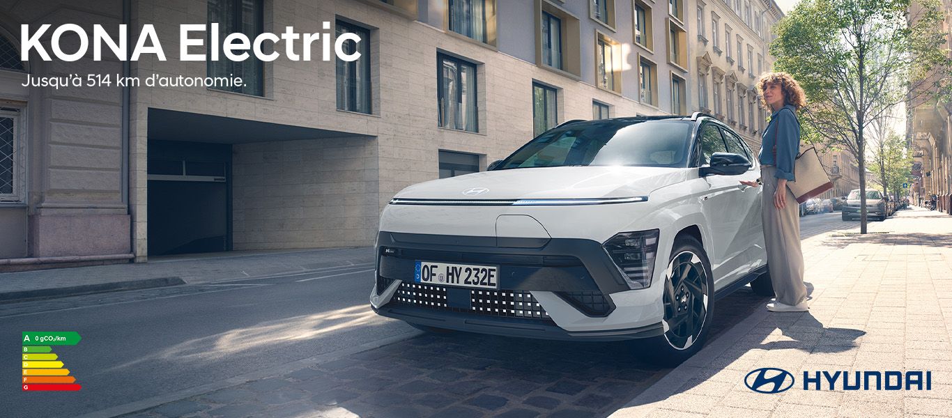 Consommation (cycle mixte WLTP) Gamme Hyundai Kona Electric Nouvelle Génération : 21.7 kWh/100 km - Émissions de CO2 (cycle mixte WLTP) : 0 g/km